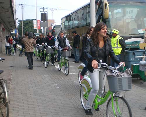 10.29日蘇州某旅行社為法國旅行團(tuán)租借公共自行車游蘇州古城區(qū),公共自行車成為外地游客游玩蘇州的一種新型的旅行方式。
